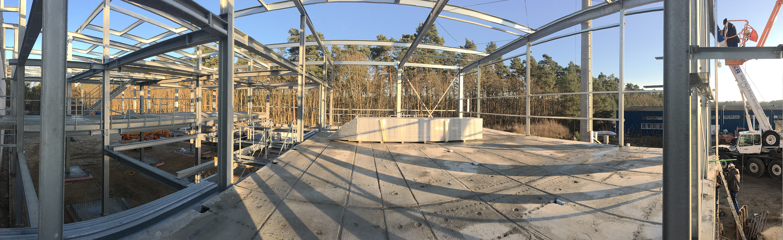Wir hatten Glück mit dem Wetter und konnten durchbauen. Das Dach ist drauf und die Fenster sind gekommen. Jetzt fehlen noch die Tore und dann können wir die Bodenplatte gießen. Unser Stapler ist schon gantz nervös. Er fährt ständig im Kreis bis seine Batterie leer ist und freut sich auf die Bodenplatte. [caption id="attachment_6435" align="aligncenter" width="3024"] Blick...