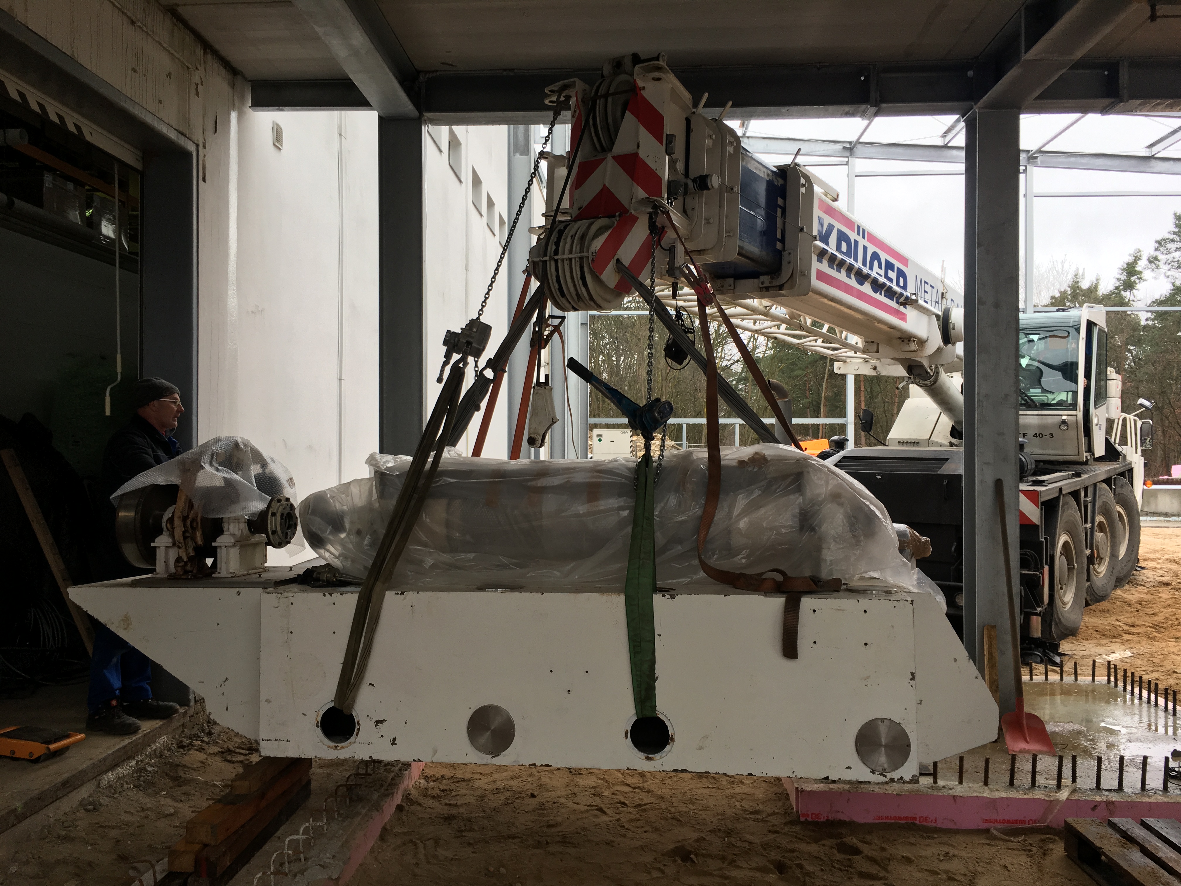 Heute wurde der 5,5 Tonnen schwere Agfa Gießtisch, welchen wir und aus der Insolvenz in Leverkusen 2005 gesichert hatten, aus dem Bestandsgebäude geholt. Dazu musste extra ein Katzbahnträger hergestellt und angeschlagen werden. Danach konnte der Kran den Tisch vorsichtig herausziehen. Später wurde er mit einem 100T Kran auf die obere Ebene gesetzt und gut verpackt....