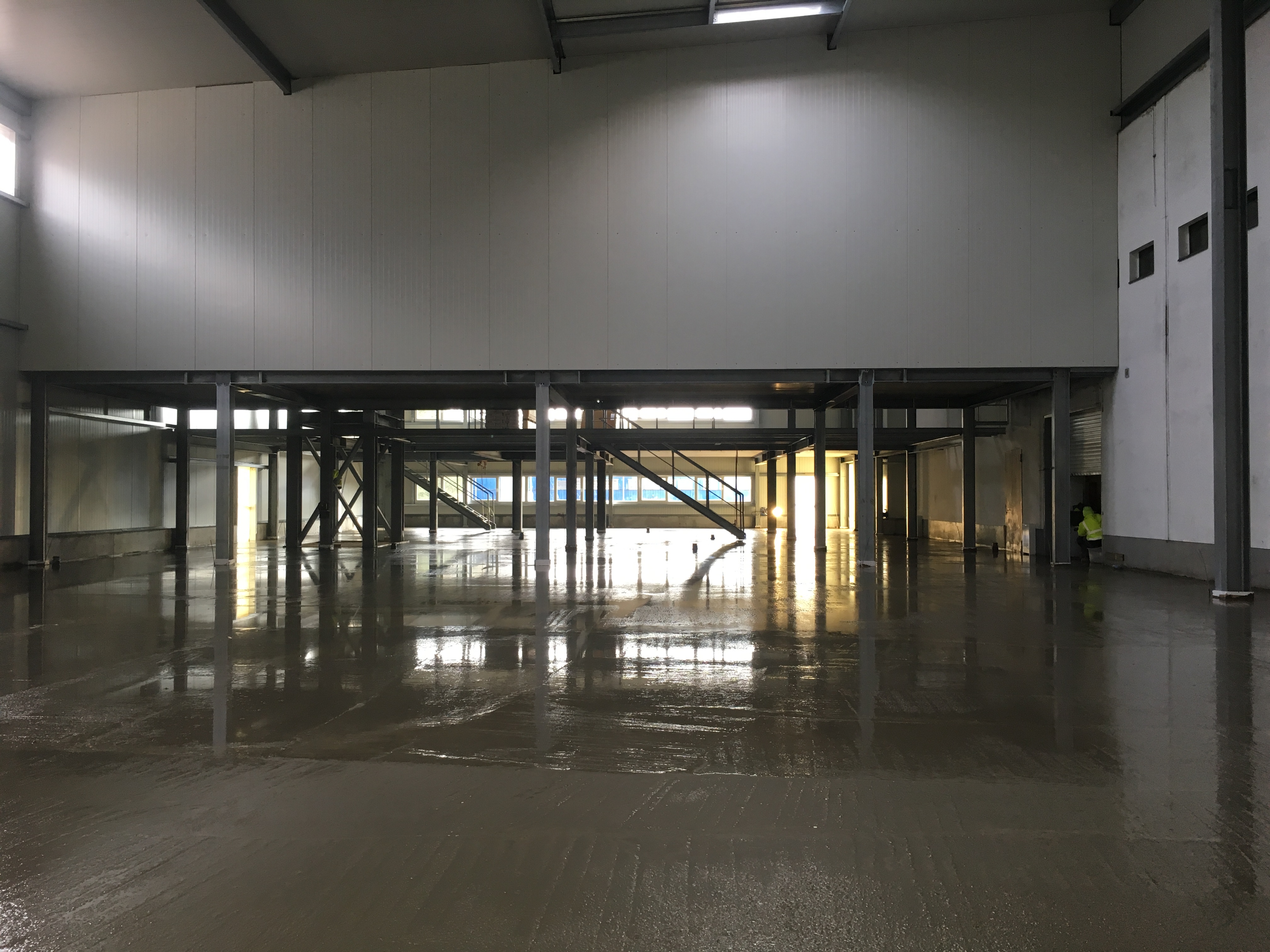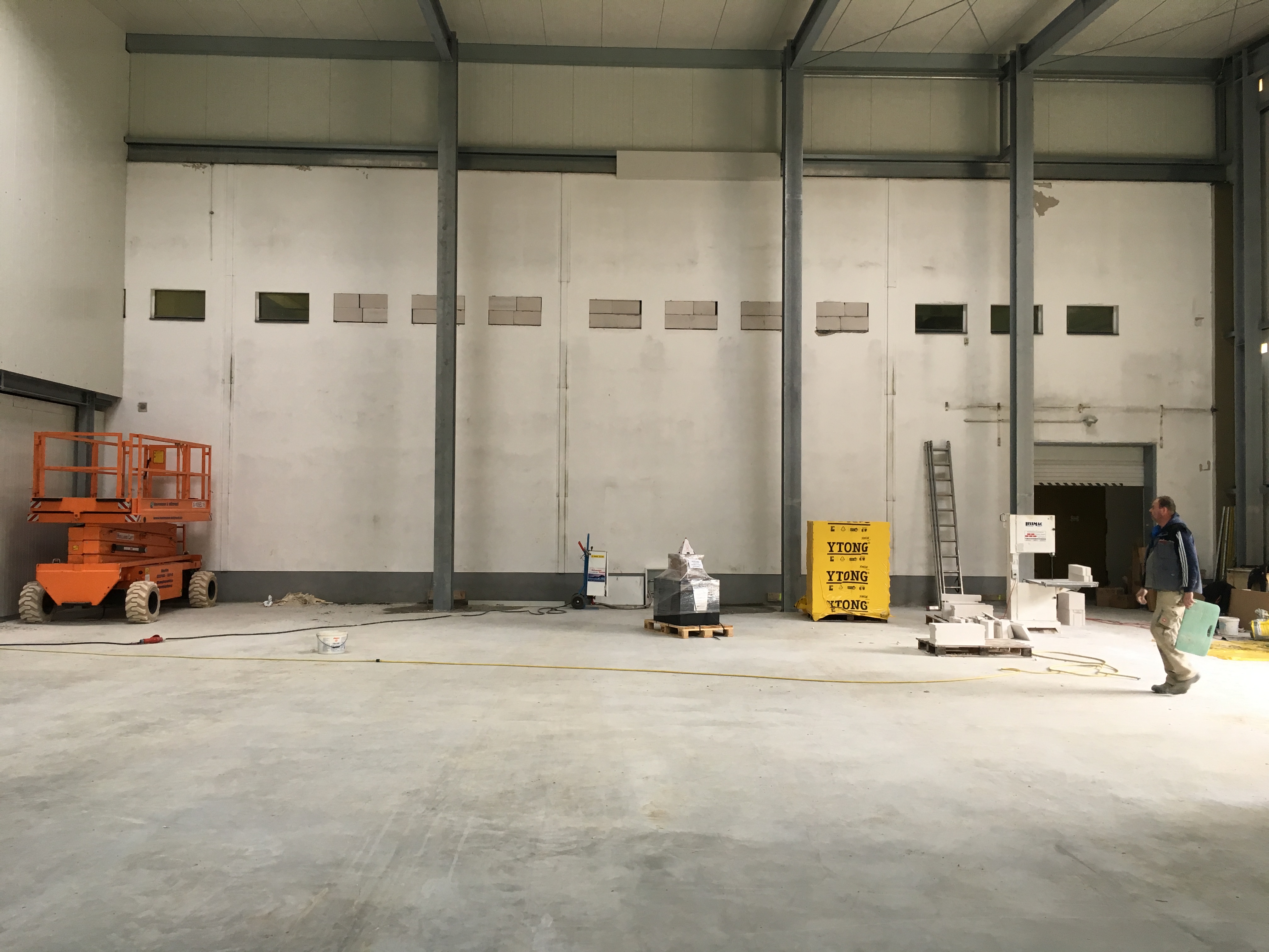Im Mai und Juni wurde der Gefälleestrich auf den Betondecken vergossen und der Boden gefliest und verfugt. Zwischendrin haben die Trockenbauer die meisten Arbeiten abgeschlossen. Die Elektriker haben die Verteilerkästen montiert und durch den Bestandsbau neue Kabeltrassen verlegt. In der großen Halle hängen schon die neuen LED Leuchten an der Decke. Wir haben den Gießer ausgepackt...