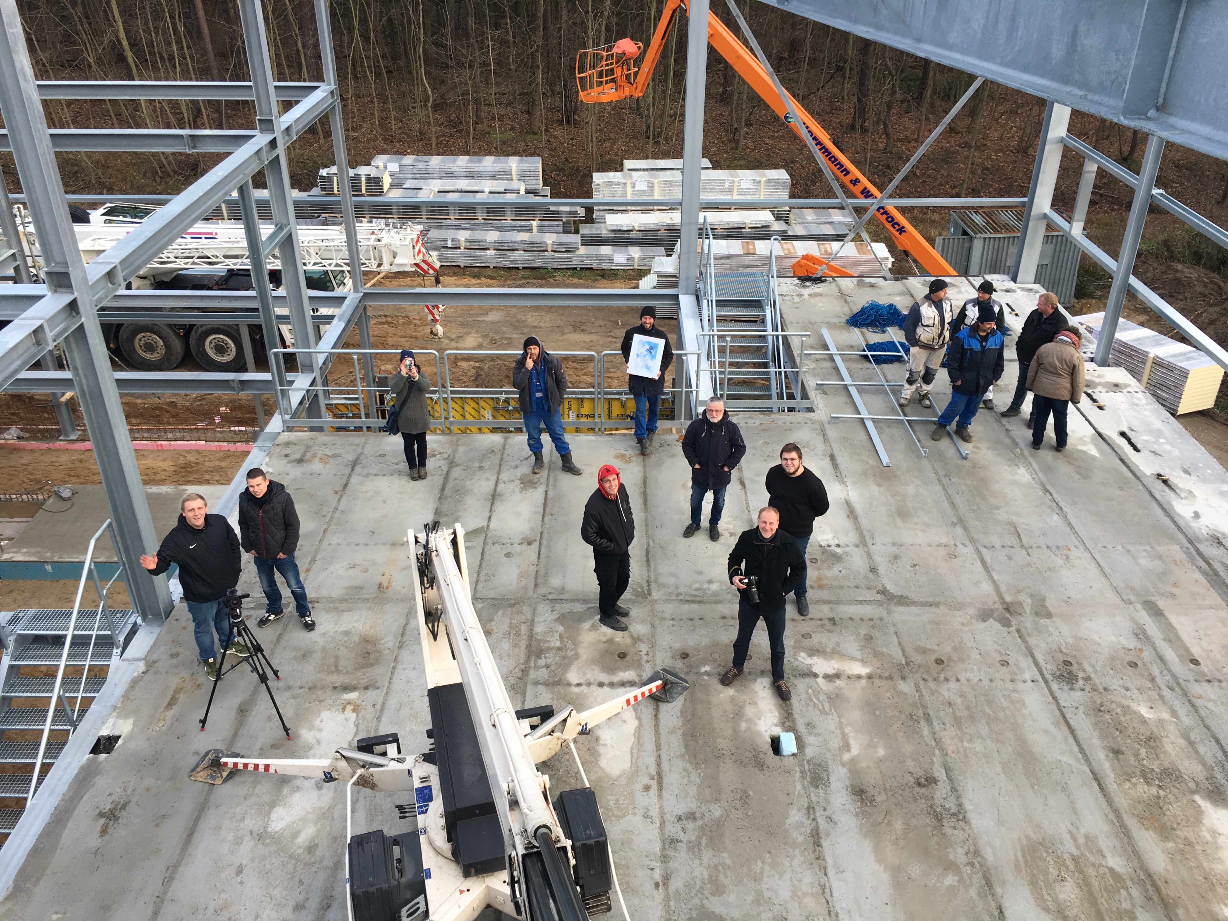 Heute war Richtfest. Der Vorarbeiter hat den Richtspruch verlesen (adaptiert auf Stahltragwerke) und der Bauherr durfte eine (eigens wieder gelockerte) Schraube am Tragwerk mit den vorgeschriebenen 800kN und einem Drehmomentschlüssel mit 85cm Auslage anziehen. Das war gar nicht so leicht. Gut, dass es vorher zur Stärkung ein Glas Sekt gab. Cheffe ist zwar 1,90 m...