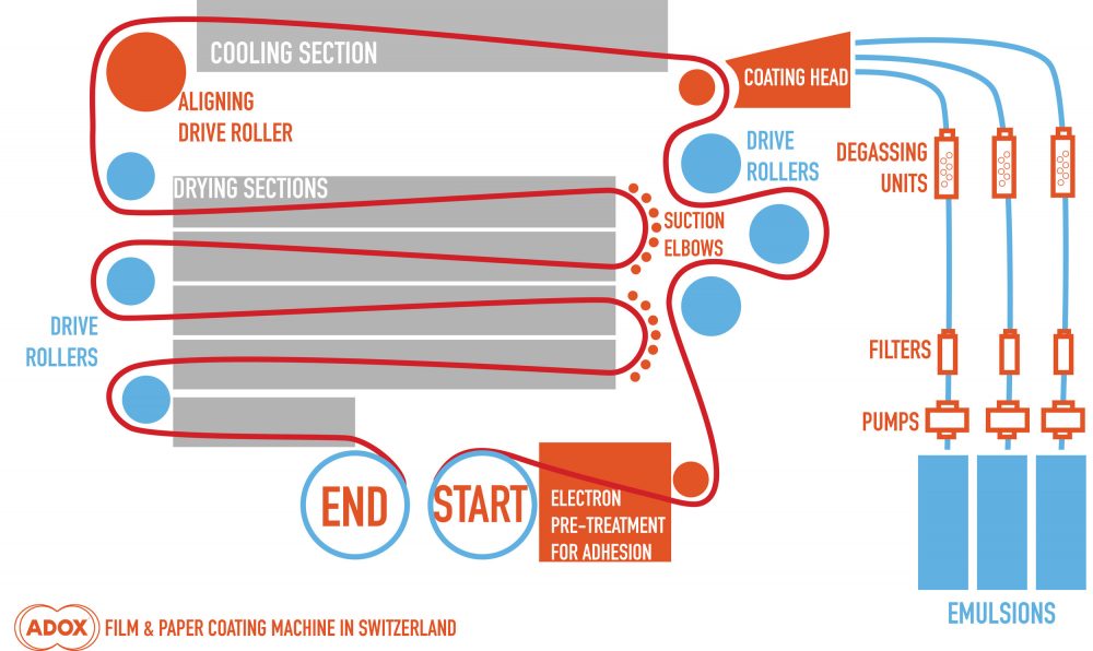 The ADOX Switzerland coating machine is of a research size, allowing relatively small coatings compared to the big players on the analog market. One single coating, with all the preparations and subsequent cleaning, can take up to four work days.