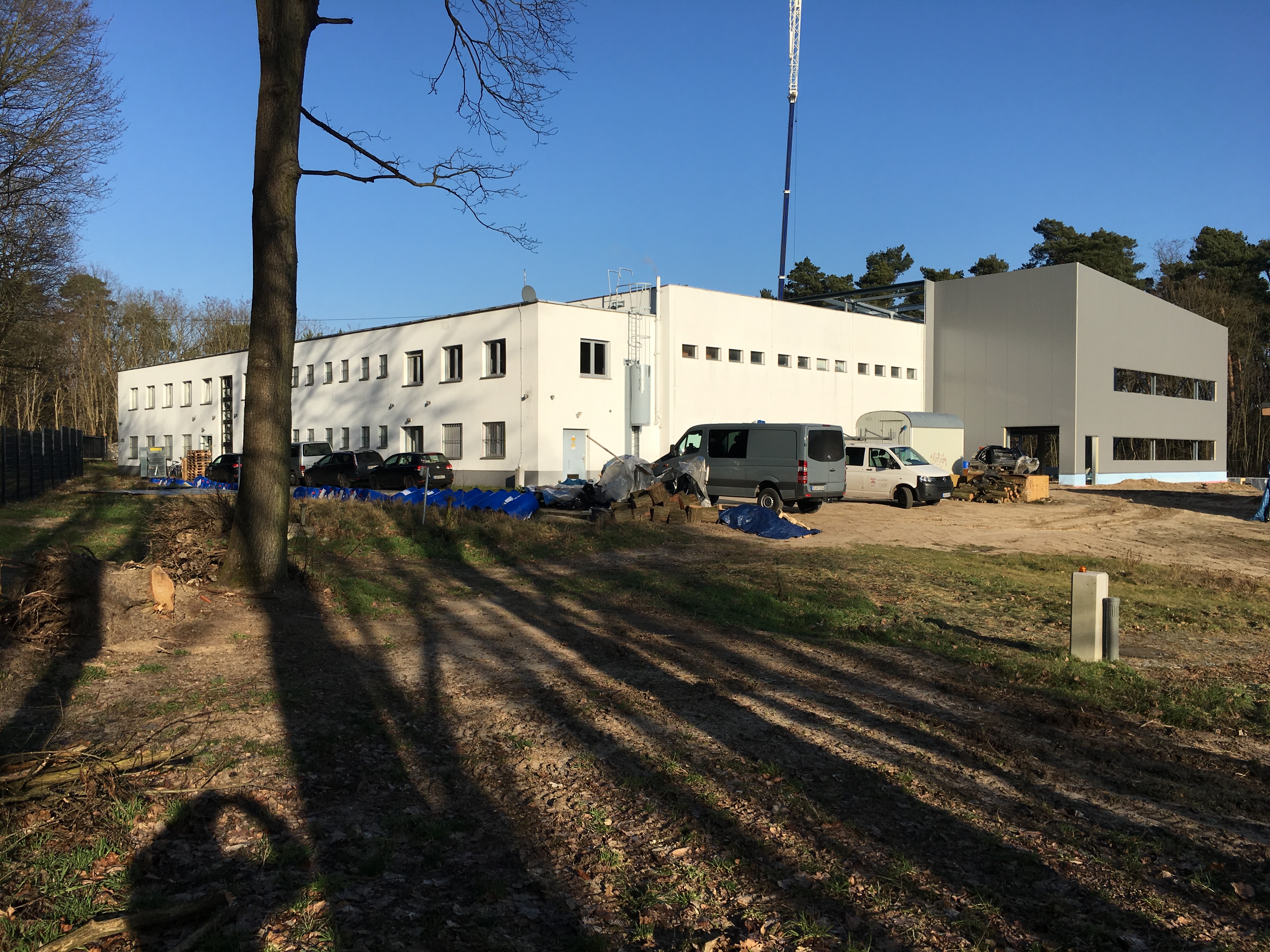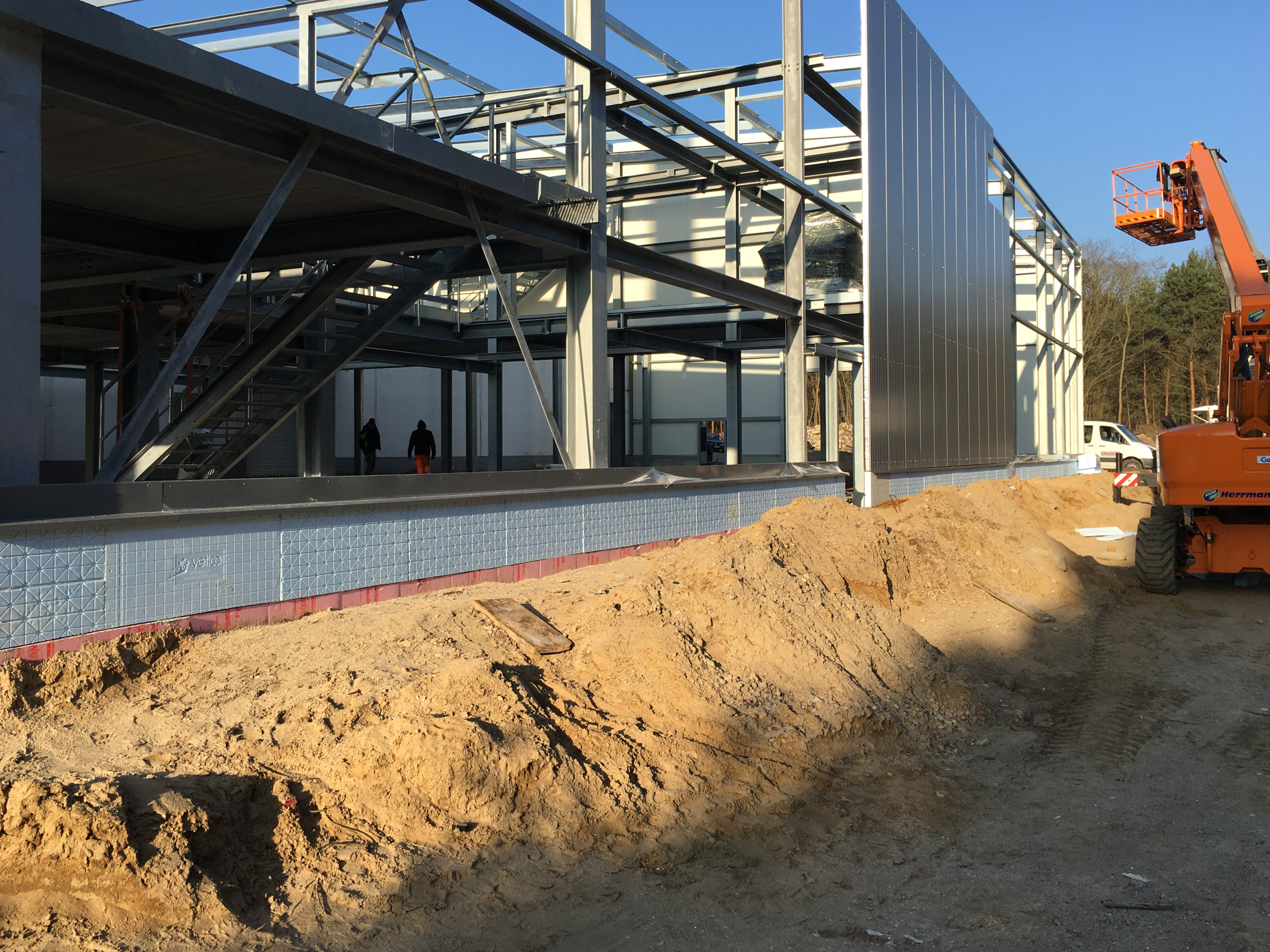 The outer fassade is closing. The Southbound and northbound walls are already set and the long side facing east is currently being mounted. Inside the floor is being constructed.