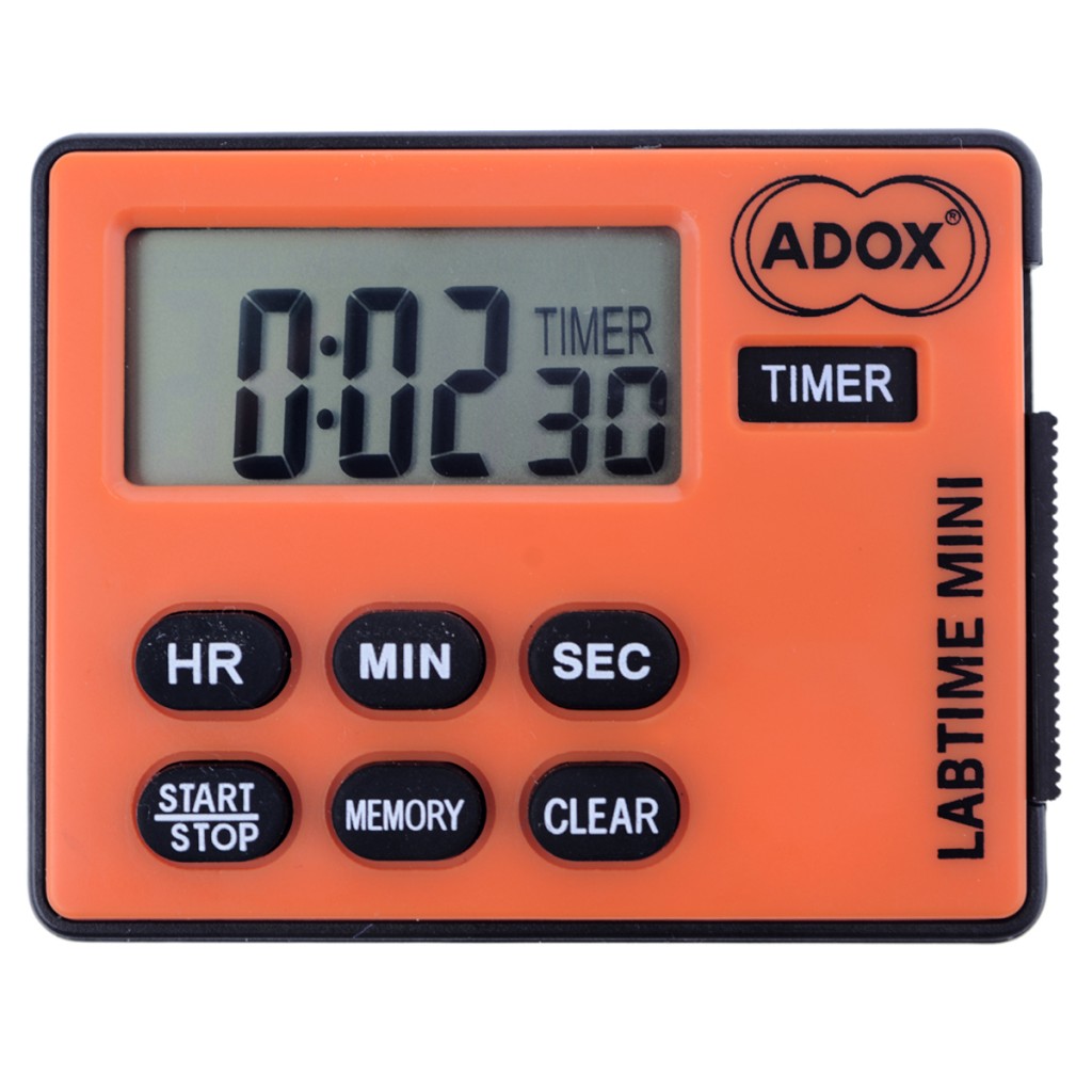 Die ADOX LABTIME MINI kann sowohl vorwärts als auch rückwärts zählen. Sie können so wahlweise die Zeit messen welche bis zum Eintritt eines Ereignisses abläuft (COUNT-UP) oder eine vorgewählte Zeit ablaufen lassen (TIMER) und dann einen Prozess bei Ablauf stoppen oder messen. Bei der TIMER-Funktion kann die Vorwahl gespeichert werden, so dass der Countdown beliebig oft wiederholt werden kann. Dazu benötigen Sie drei Tastendrücke: STOP (stoppt den alten Countdown), MEMORY (führt den Rücksprung auf die vorgewählte Zeit aus) und START um den neuen Prozess zu stoppen. Auf der Rückseite der LABTIME MINI sind 4 Gummifüßchen angebracht, so dass diese Tastenkombination einhändig durchgeführt werden kann wenn die LABTIME MINI auf einer stabilen Unterlage liegt. Im Fotolabor können Sie die LABTIME MINI z.B. für folgende Aufgaben einsetzen: