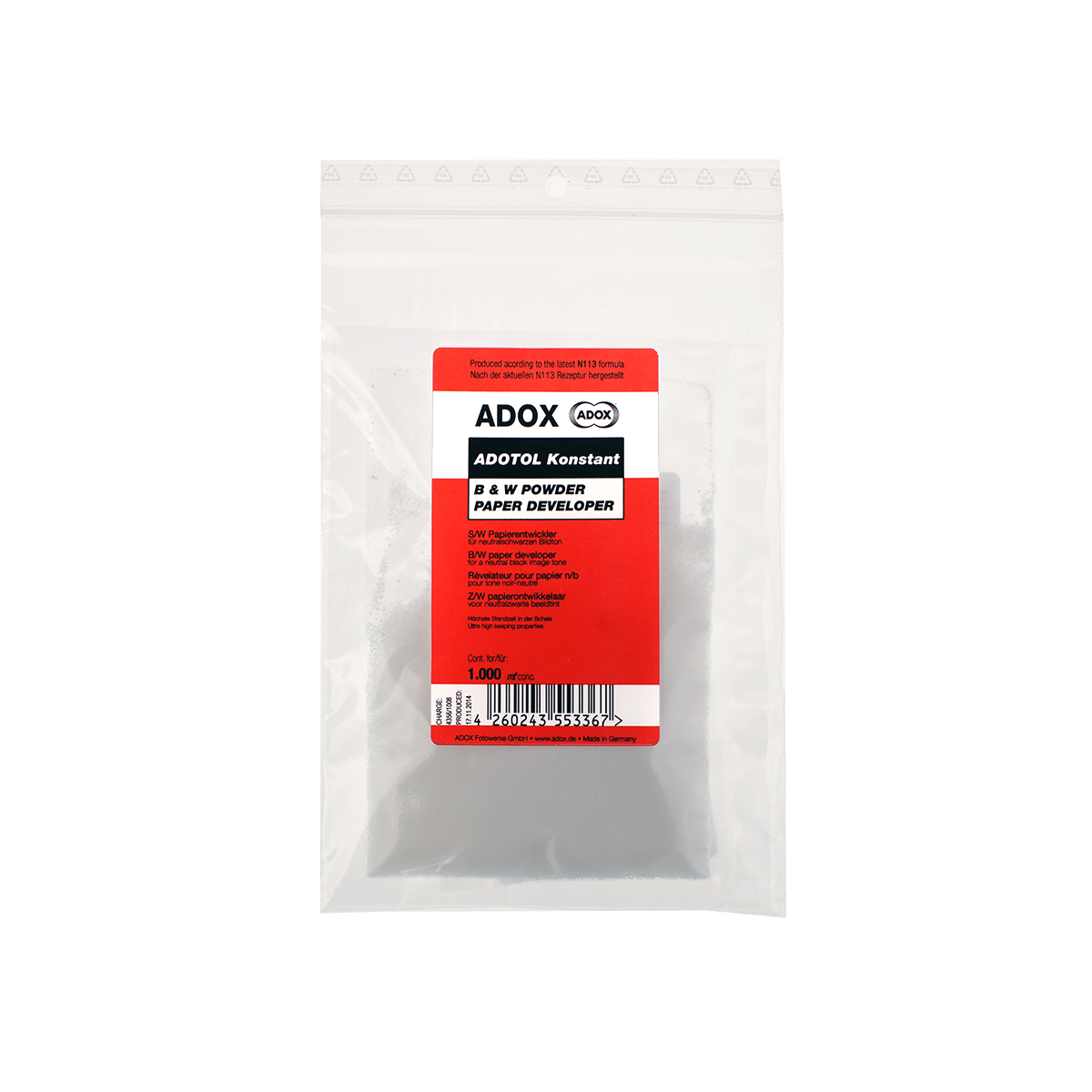 ADOTOL KONSTANT é un rivelatore per carta fotografica in polvere, per neri dai toni neutri ed un’eccezionale durata e capacità di sviluppo. Adatto allo sviluppo sia in casa che in laboratorio, ADOTOL KONSTANT mantiene i tempi di sviluppo stabili fino alla fine, dando ottimi risultati e conservandosi a lungo. Disponibile in due formati: Per 1 litro di soluzione (per c.a 4m² di carta) Prodotto secondo la formula del rivelatore ORWO N113. Rivelatore universale per carta in polvere