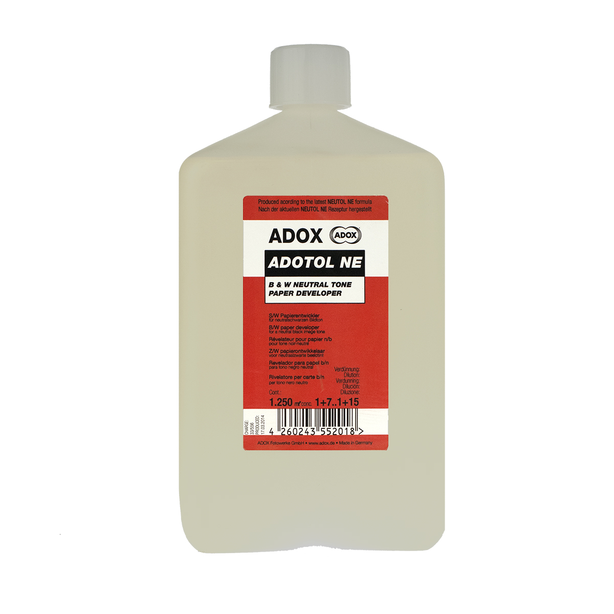 NEUTOL NE liquido viene prodotto secondo la formula originale Agfa*. È particolarmente indicato per lo sviluppo di ADOX MCP e ADOX MCC e in generale qualsiasi carta fotografica che volete sviluppare con neri neutri. Con NEUTOL NE otterrete delle ombre profonde e consistenti. Indicato per lo sviluppo in vaschetta o macchina a telai. Formula concentrata per diluizioni tra 1+7 e 1+15. Con 1+7 otterrete la massima qualità, resa e durata. Diluizioni maggiori sono consigliate nel caso in cui vogliate sviluppare solo alcuni fogli e l’intervallo tra le singole sessioni sia lungo. I tempi di sviluppo vanno calcolati in base alla diluizione (vedi Scheda Tecnica) Formati: Scheda tecnica ADOTOL NE (tedesco) Dati Sicurezza Materiali ADOTOL NE Sviluppo carta per neri neutri